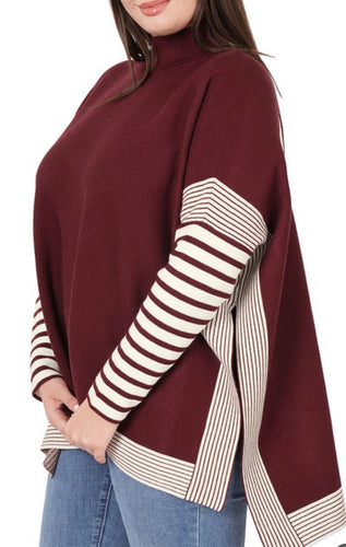 Plus Contrast Stripe Mock Neck Sweater-Burgundy